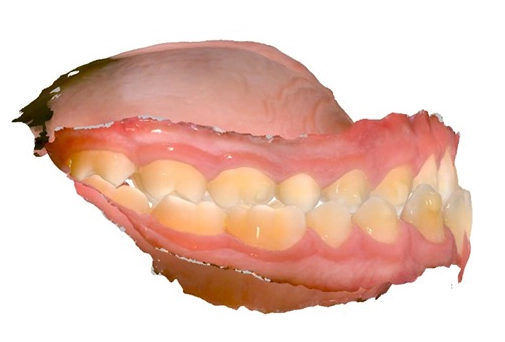 From the frontal view, the left side is not visible beyond the upper primary canine. It is difficult to see what teeth are present or missing, and most clinicians could not confidently determine if there are transverse issues present. When assessing the intraoral image generated by the scanner, one can see all of the teeth and can observe the palatal inclination of the posterior crowns bilaterally. But most importantly, it can be clearly seen that there is no posterior crossbite. This is also confirmed via the sagittal view of the scanner image, which provides a more accurate display of the current occlusion. Moreover, the sagittal view from the scan shows a significant overjet, which is not as evident in the image obtained from the DSLR camera.